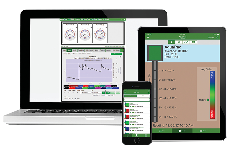 • Citiți valori de la aproape toate mărcile majore de sonde de umiditate a solului, inclusiv AquaCheck, Sentek, Decagon și Watermark.